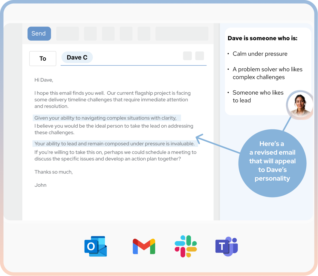You and your team can use Olivia seamlessly where you all already work, tailoring messages to each person’s personality within existing workflows.