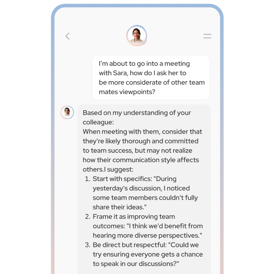 Olivia gives teams real-time, personality-aware coaching to build understandings that reduce friction and boost collaboration.