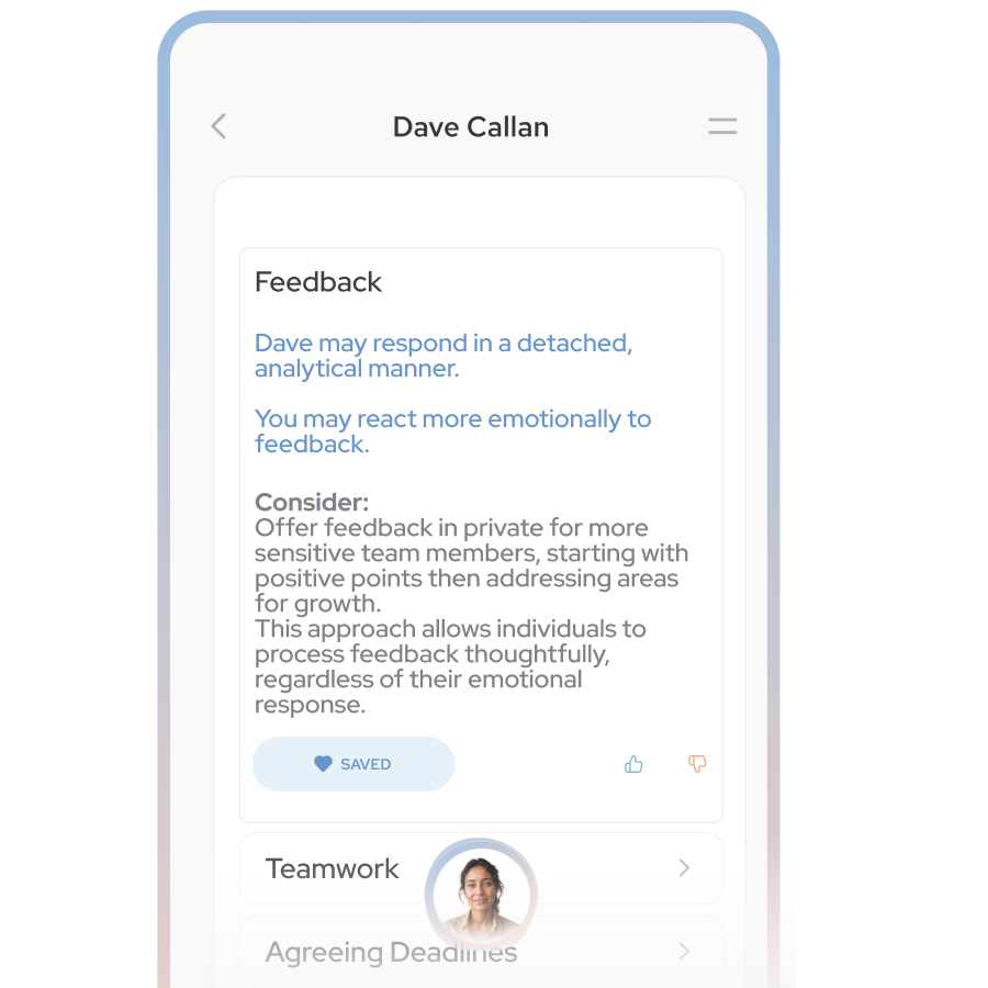 For everyone in your team, get tailored, personality-based guidance on how to give feedback, resolve conflict, and communicate effectively .
